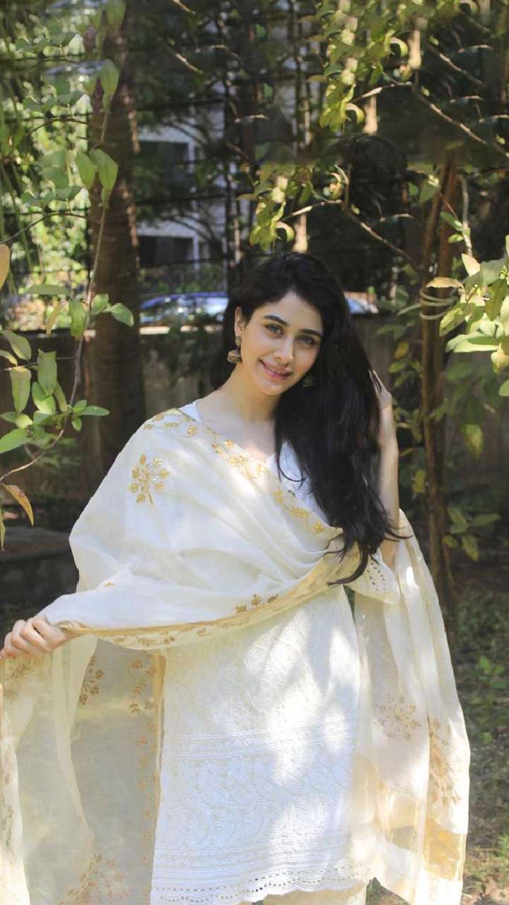 व्हाइट हैवी वर्क फुल स्लीव्स सूट में हिना खान गॉर्जियस लग रही हैं। कानों में पर्ल के झुमके और हल्के कर्ली बाल इस लुक पर चार चांद लगाते नजर आ रहे हैं।