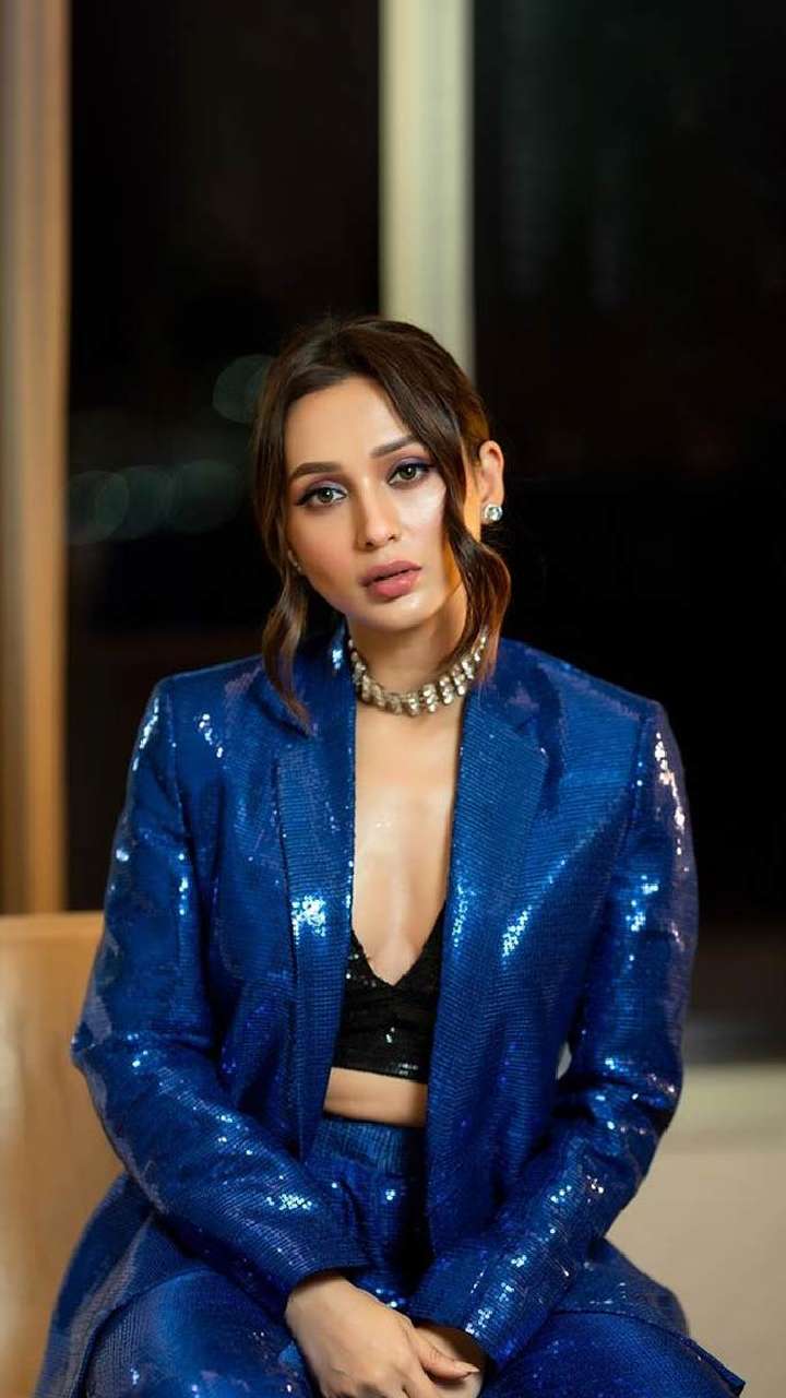 डार्क ब्लू कलर के शिमर पैंट, मैचिंग ब्लेजर और ब्लैक ब्रालेट क्रॉप टॉप के साथ स्टोन का चेकर पहनी मिमी यहां बेहद कमाल लग रही हैं।