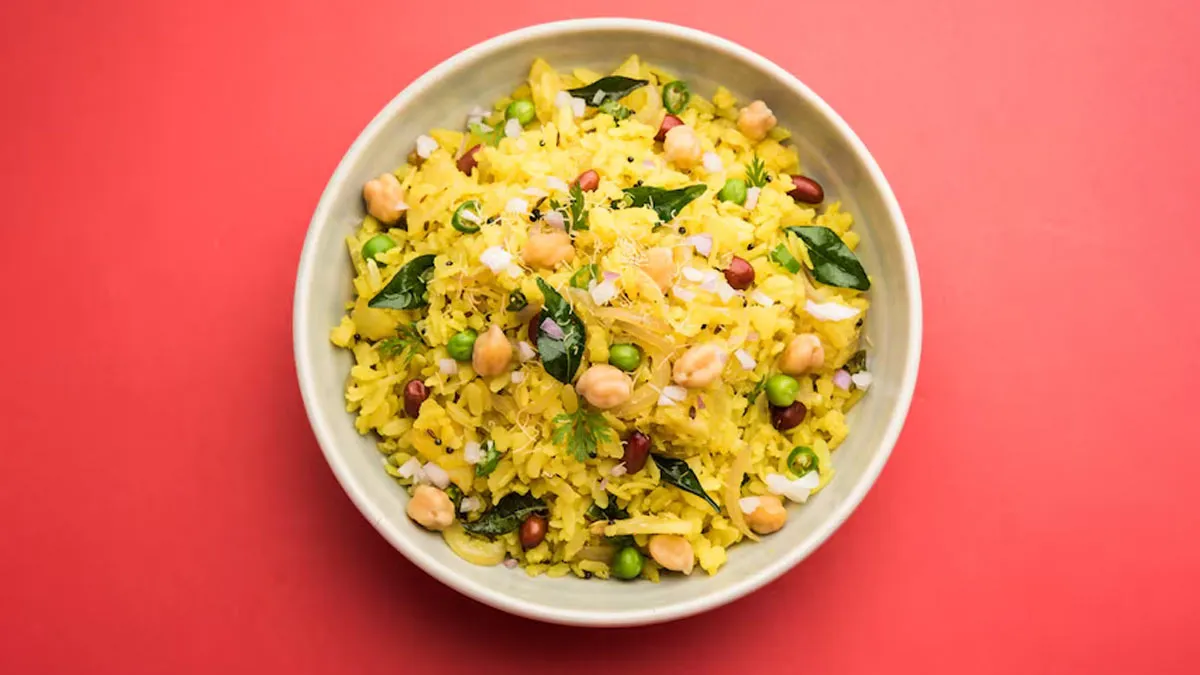 Originating from Madhya Pradesh, poha made with flattened rice, peanuts, mustard seeds, and herbs is light yet energising, averaging 250 calories per serving.