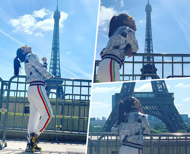 In the photographs, Hina Khan happened to be posing near the Eiffel Tower wearing a newspaper print sweatshirt with track pant and a pair of sneakers. She was accompanied by her boyfriend Rocky Jaiswal, who featured in a few of her Instagram stories posted from Paris. She could also be seen kissing her boyfriend in front of Eiffel Tower in one of the Insta posts.
