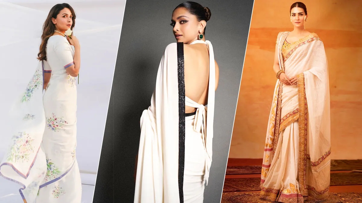 Here are some gorgeous white saree designs inspired by bollywood beauties that are ideal for Navratri 2025.