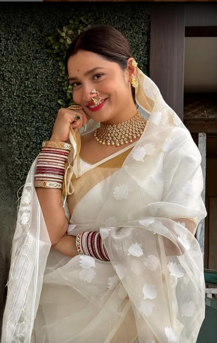 Ankita Lokhande embraced her cultural roots with a bold and beautiful Maharashtrian nath. The design had a curved shape with white stone and pearl embellishments, traditionally worn on the left side. This style adds a strong regional identity and works best with Paithani sarees or nauvari drapes for a traditional Marathi bridal feel.