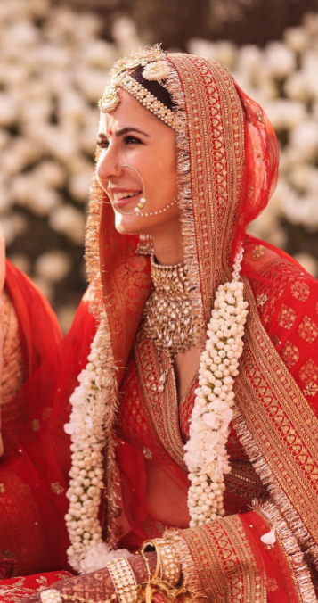 Katrina Kaif looked every bit like a royal bride in her traditional wedding attire, and her delicate pearl bridal nath added a graceful touch. The design featured a thin gold hoop adorned with soft pearl detailing and a dainty chain hooked to her hair, giving it a classic and elegant vibe. It's the perfect pick for brides going for a subtle, regal look.