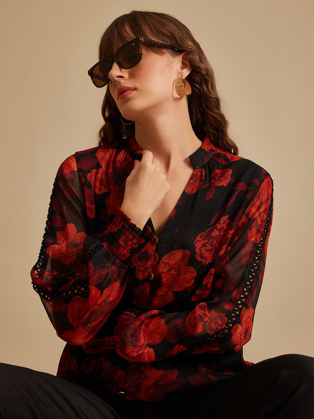If you’re heading to a meeting or conference and are looking for a shirt, opt for this puff-sleeve floral shirt design. The shirt has a moody black base which is enhanced with pastel lavender and rust orange floral prints. The full-length puff sleeves combined with the modern V neckline make this an ideal choice for formal occasions.