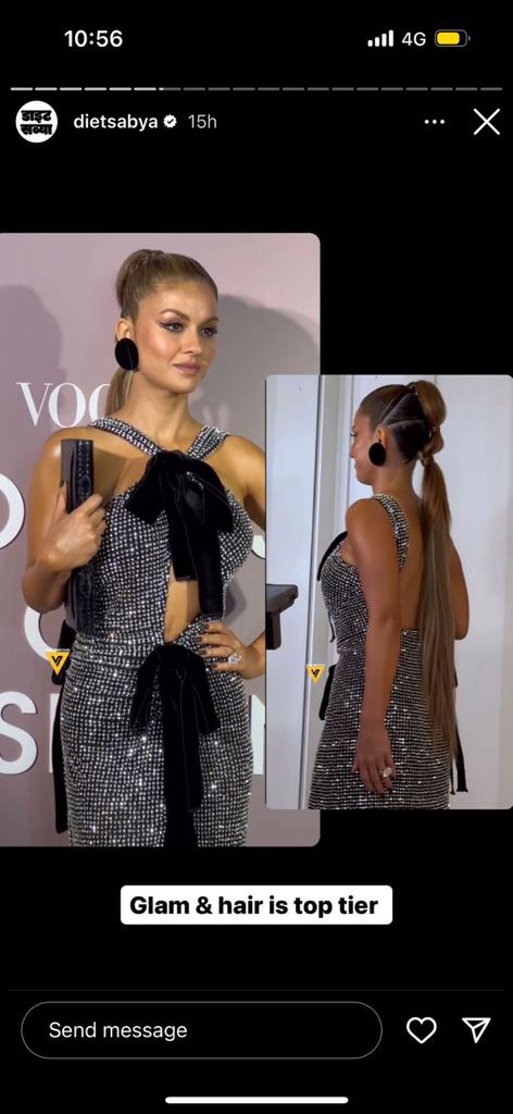 Natasha Poonwalla’s recently donned Tom Ford sleeveless gown featured a halter style neckline, a cut-out on the midriff, black velvet bow embellishments on the front, a cinched waist, backless and body hugging design, a thigh-high slit and all over silver embellishments. She styled it with a pair of black pumps, velvet round earrings, a diamond ring, a sleek ponytail, a graphic black eyeliner, blushed cheeks, a luscious brown lip, defined brows and a shimmer laden eyeshadow.