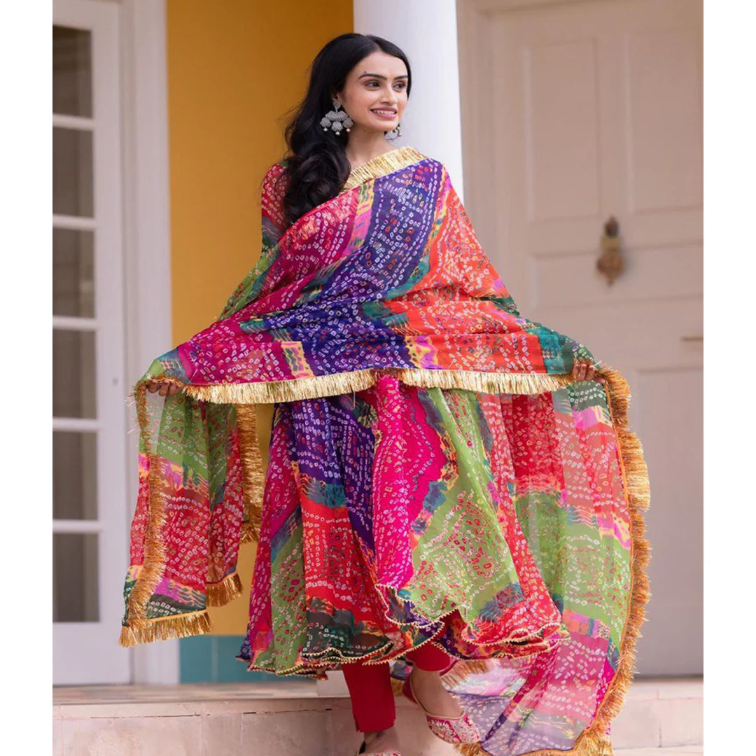 Bandhani print dupattas have these cool tie-dye patterns and bright, bold colours. When you pair a colourful Bandhani dupatta with a plain suit, it really stands out and gives your outfit a mix of traditional and modern vibes. The detailed patterns and vivid colours in this design make it a top pick for any occasion.