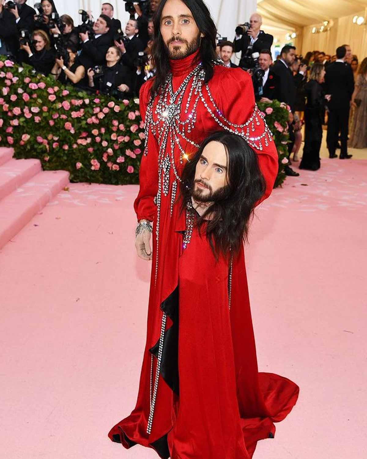 Celebrities also get creative with their accessories. Jared Lato, the actor known for his varied gigs and methods, in 2019 carried a life-sized replica of his own head in his hands, and pop empress Madonna in 2017 carried her own bottle-green hip flask of rosé wine to the event. Frank Ocean, the singer-songwriter hailed as an icon of introspection, carried a neon-green robotic baby as his date to the event in 2021.
