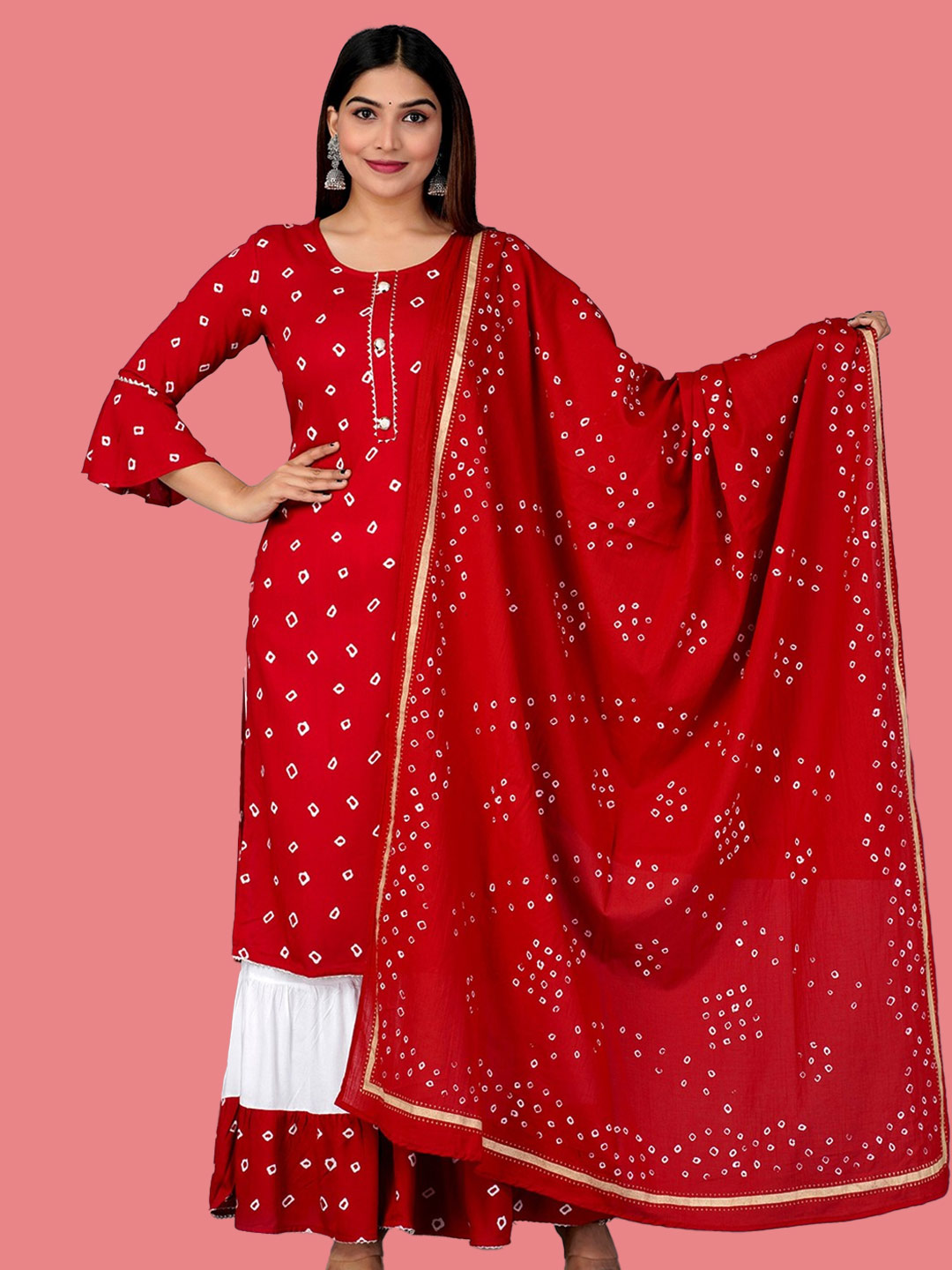 This red Bandhani printed sharara suit embraces traditional charm. The look is accentuated by a gold Gota Patti heavy dupatta, perfect for a timeless ethnic look with festive flair.