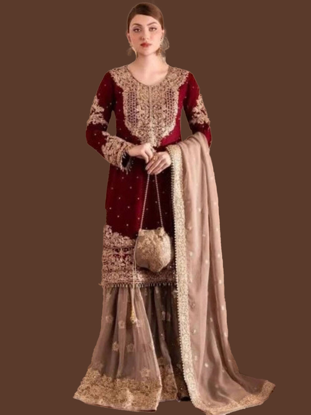 Make a bold statement with a dark maroon sharara suit adorned with golden embroidery. A heavy beige contrast dupatta adds elegance and elevates the outfit for more formal Eid celebrations.