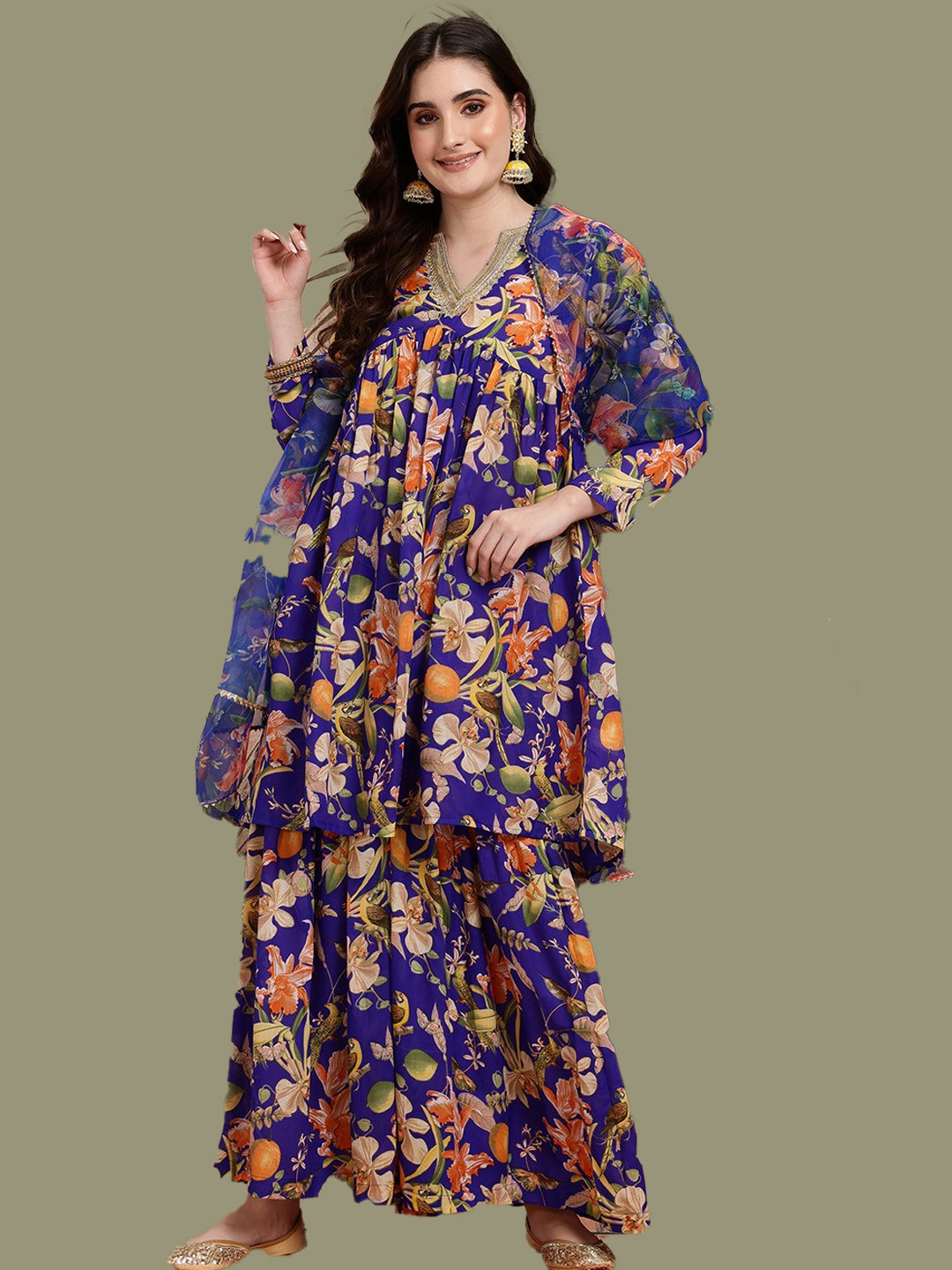 A dark blue base floral print sharara suit that’s equal parts playful and elegant. It’s paired with a net dupatta featuring an embellished border, perfect for adding grace to your Eid wardrobe.