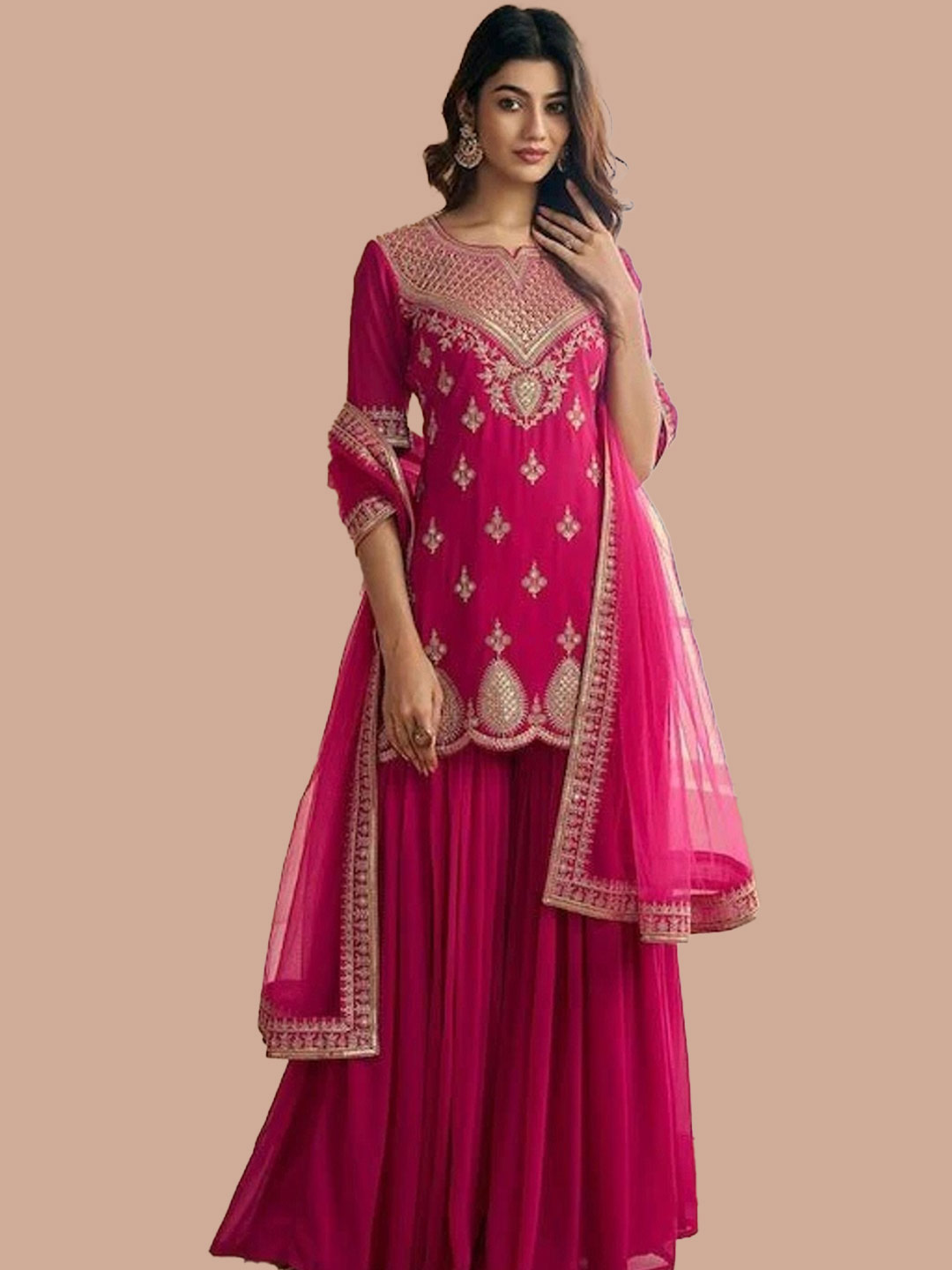 This dark pink georgette sharara suit features delicate embroidery along the neckline. The rich fabric paired with a heavily embroidered dupatta makes this outfit perfect for evening Eid events.