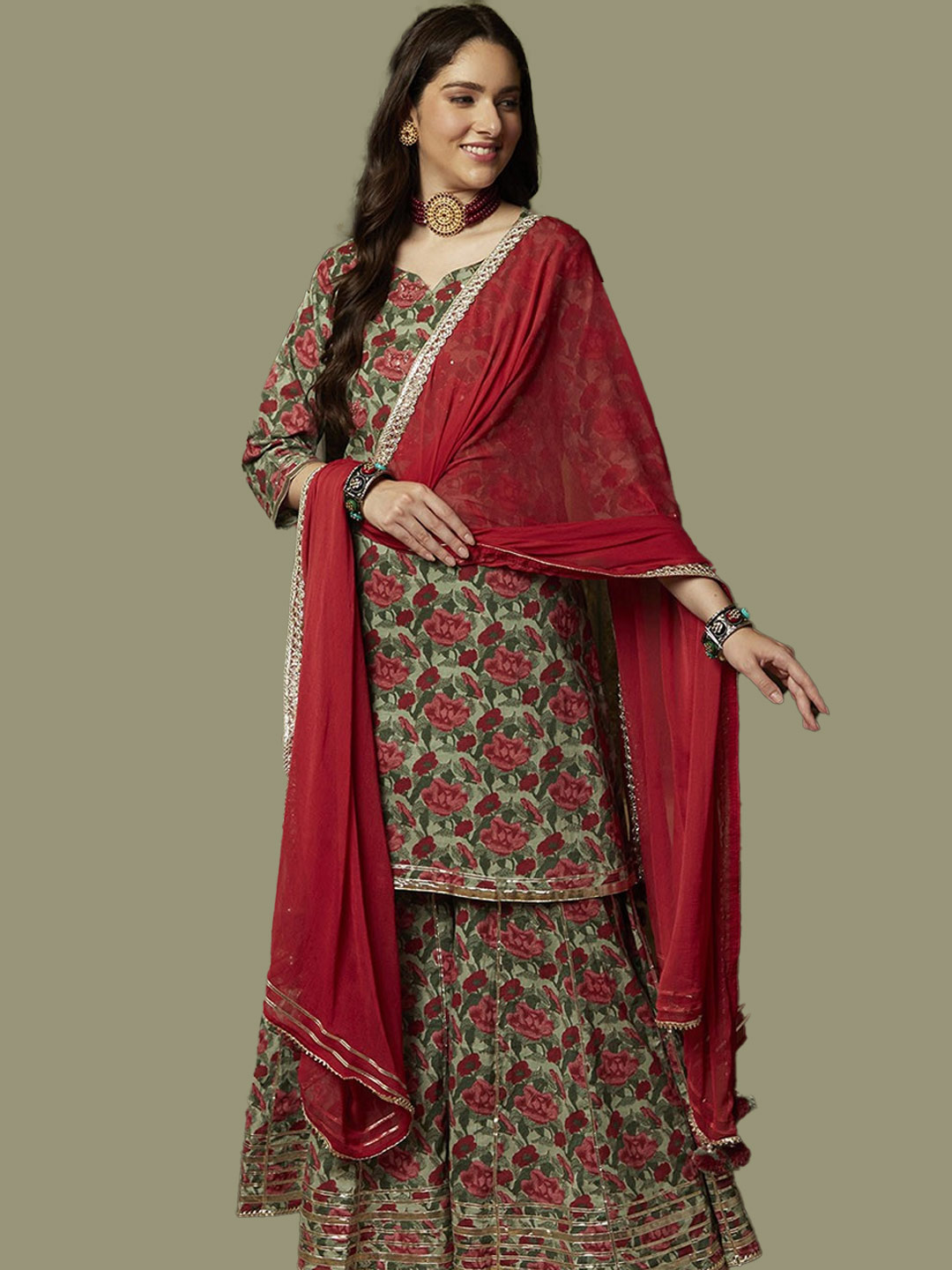 This floral green printed sharara suit is effortlessly stylish. The contrasting red dupatta with a golden border brings in a festive touch that makes it ideal for both day and night events.