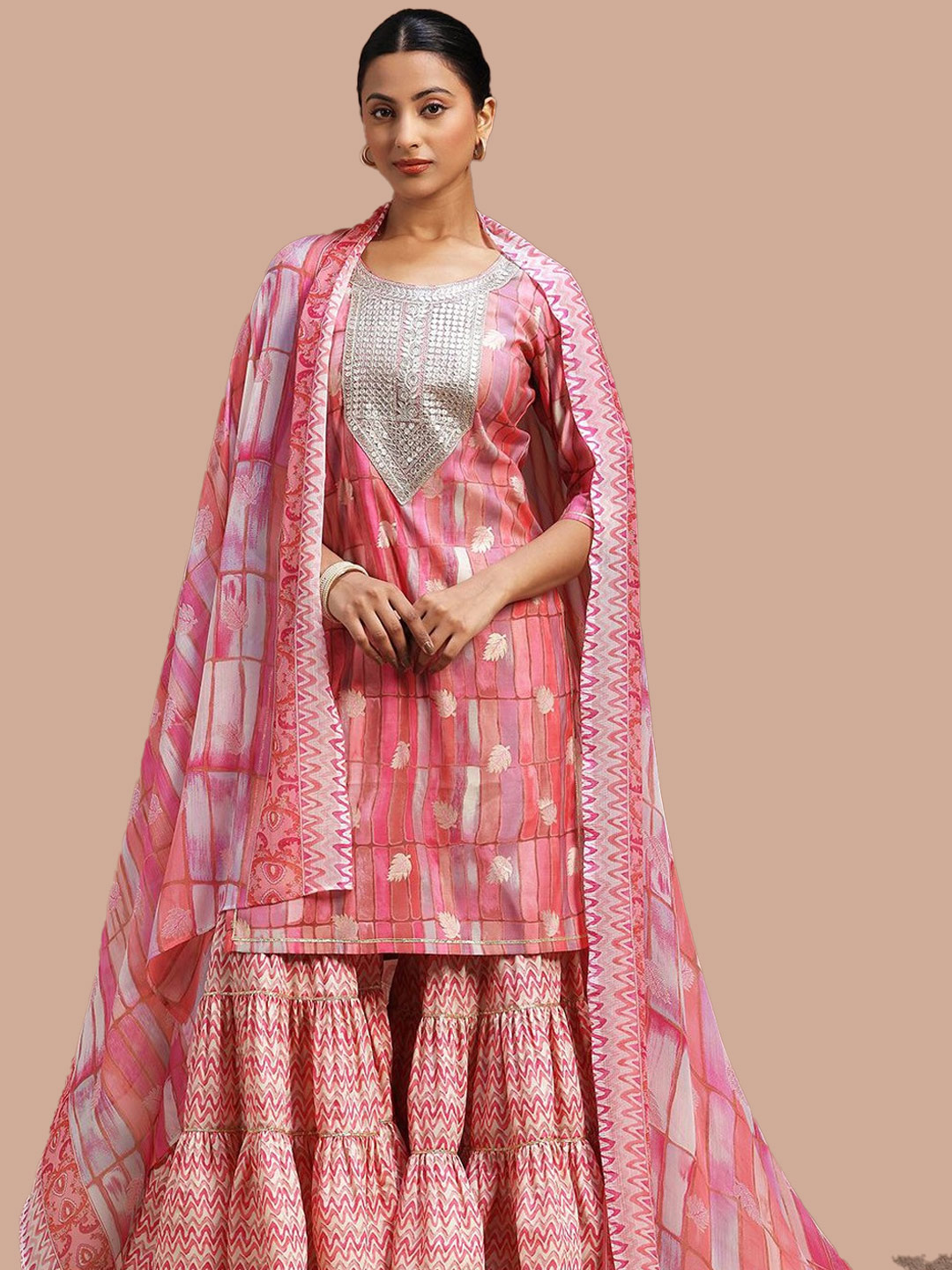 A soft pink block-printed sharara suit featuring a sequin-detailed silver neckline and matching printed sharara pants. The look is completed with a vibrant pink and white block-printed dupatta that adds a festive finish.