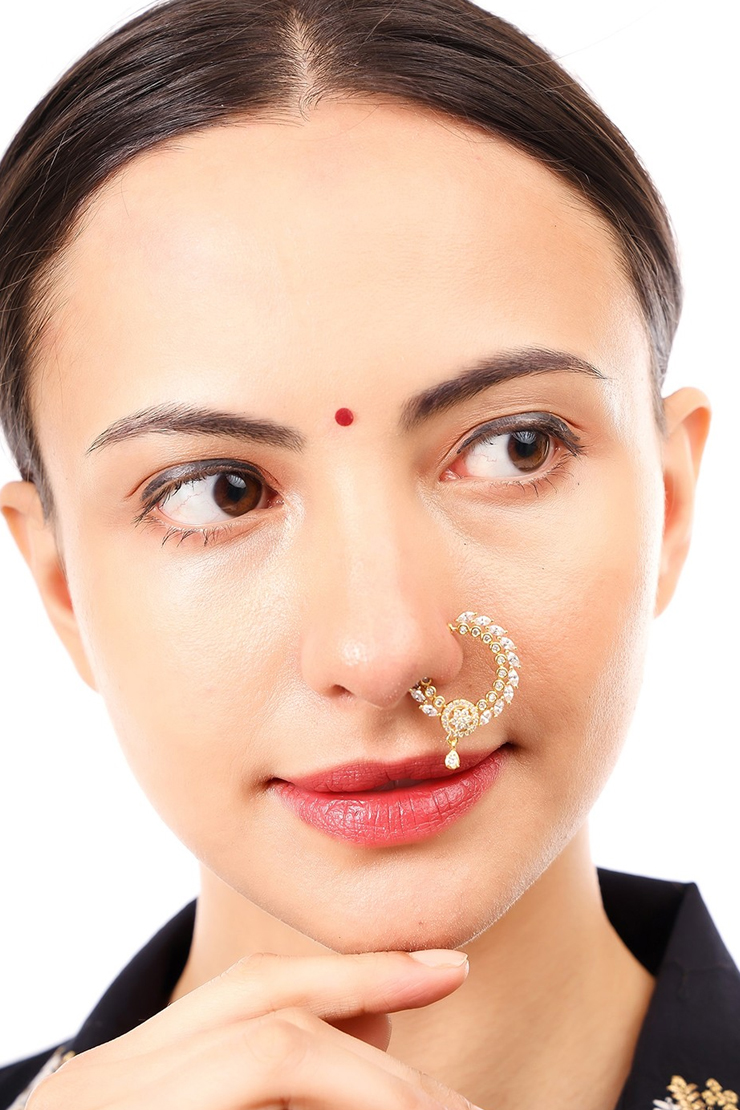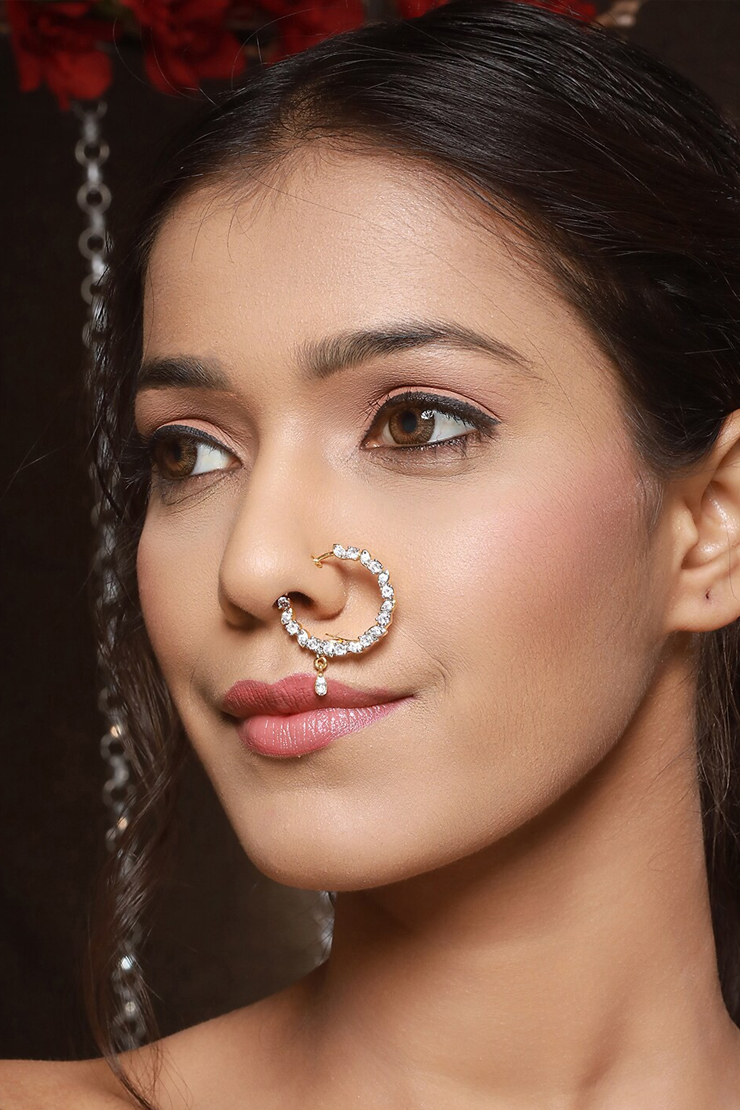 To look your beautiful best for festive occasions, try this American diamond-studded nose ring. Choose this popular nose pin with a red or white saree to look timeless and graceful. The design is ideal for a small pooja at home.
