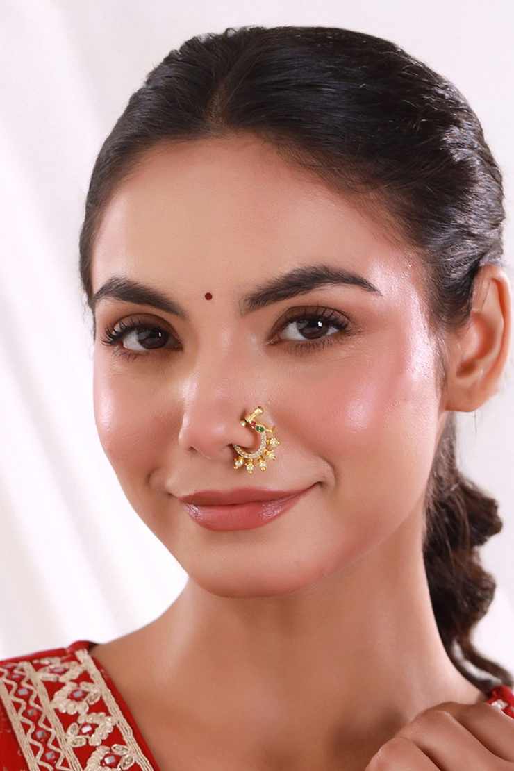 For a modern look, opt for a beautiful gold-plated stone-studded nosepin. This design combines the fluidity of nature with intricate detailing and screw closure. The nath is perfect for newlyweds. Must try this design to give it a unique look.