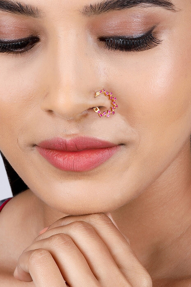 Elevate your saree look with this classic gold-plated zigzag-shaped nose ring. The design features pink stones. The design is incredibly versatile and can be paired with cotton suits, kurtas, or even Indo-Western outfits for a unique and stunning look.