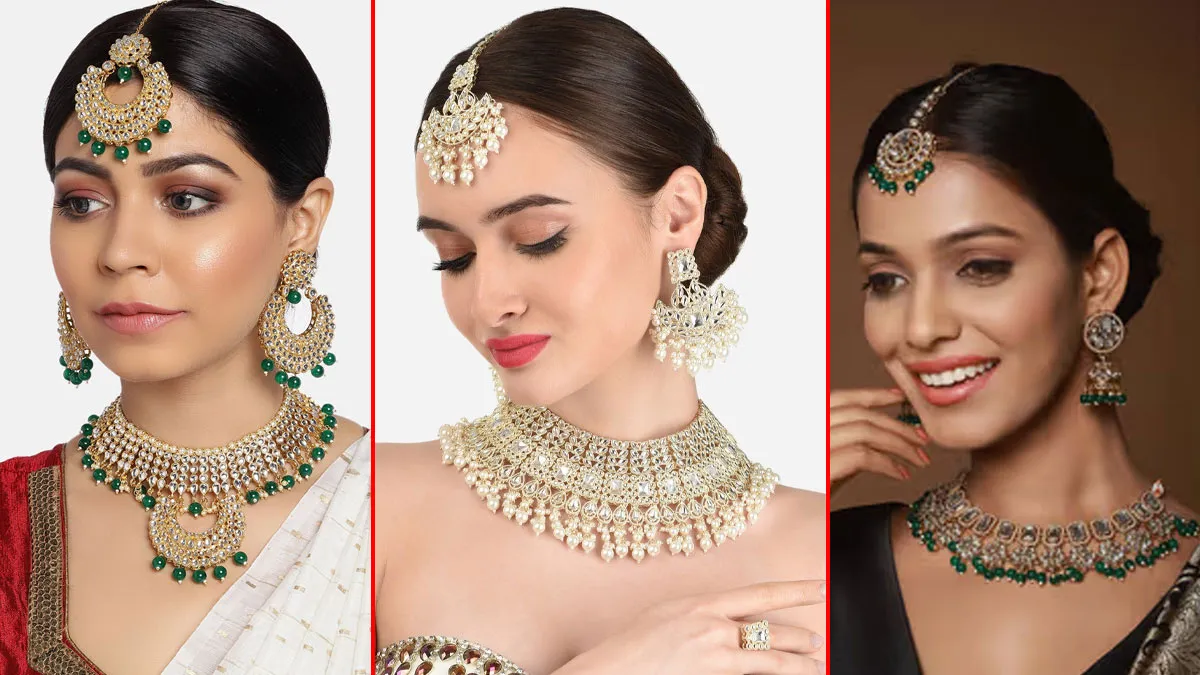 अगर आप एक जैसे ज्वेलरी सेट को पहनकर बोर हो गई है और अब कुछ यूनिक ट्राई करना चाहती हैं, तो यह चोकर नेकलेस, झुमकी मांग टिका ज्वेलरी सेट भी एक अच्छा ऑप्शन हो सकता है। इसे आप शरारा गरारा से लेकर लहंगे तक हर आउटफिट के साथ शामिल कर सकती है। इस ज्वेलरी सेट के साथ आप मिनिमल मेकअप कर अपने लुक को कंप्लीट कर सकती हैं। यह ज्वेलरी सेट आपको ऑनलाइन और ऑफलाइन दोनों जगह मिल जाएगा। इस सेट को ट्राई कर आप किसी हसीना से कम नहीं लगेगी।