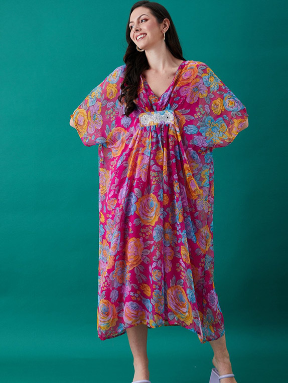 अगर आप भीड़ से अलग नजर आना चाहती हैं तो आप इस तरह की मल्टी कलर फ्लोरल कफ्तान ड्रेस वियर कर सकती हैं। यह ड्रेस जोर्जेट में है और इस ड्रेस में कई सारे फूलों का डिजाइन बनाया गया है। इस तरह की ड्रेस में जहां आप खूबसूरत लगेंगी तो वहीं आप इस ड्रेस में कंफर्टेबल भी रहेगी। इस फ्लोरल कफ्तान ड्रेस को आप ऑनलाइन या फिर बाजार से सस्ते कीमत में खरीद सकती हैं। यह ड्रेस आपको आसानी से 600 तक की कीमत में मिल जाएंगी। जिसे आउटिंग के साथ दौरान मैचिंग फुटवियर के साथ वियर कर सकती हैं। यह ड्रेस आपको 400 से 500 तक की कीमत में मिल जाएंगी।