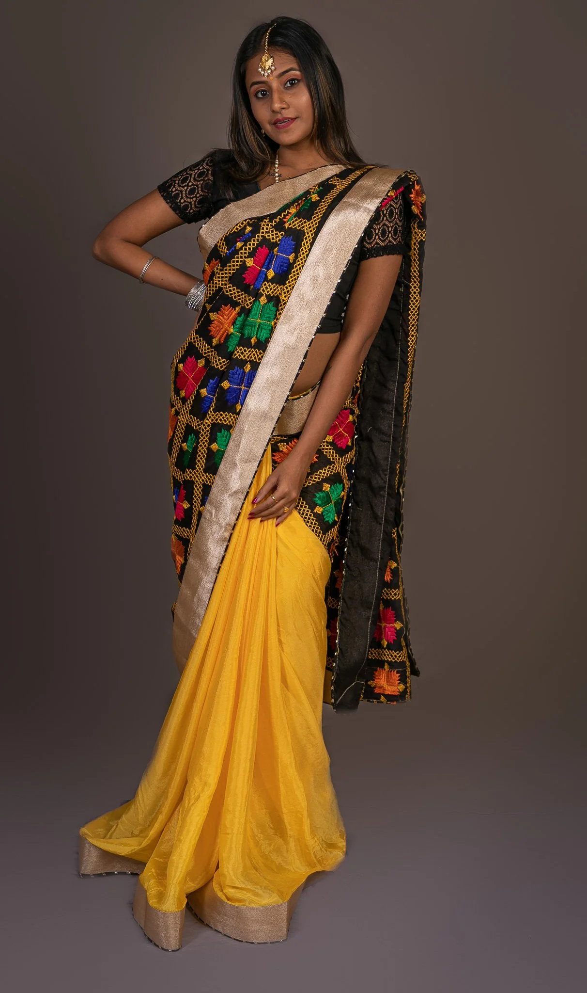 छम्मास फुलकारी डिज़ाइन में जटिल और सुंदर छम्मास पैटर्न होते हैं, जो साड़ी को एक शानदार और भव्य लुक देते हैं। यह डिज़ाइन विशेष आयोजनों और समारोहों के लिए एक आदर्श विकल्प है।