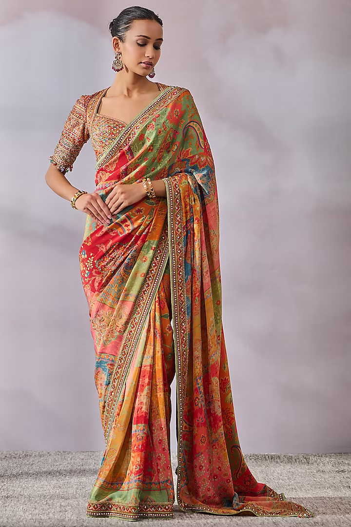 साड़ी की चुनाई: सही रंग और डिज़ाइन का चयन करें जो आपकी त्वचा की रंगत और आपकी शारीरिक बनावट के साथ मेल खाता हो। अगर आप पारंपरिक लुक चाहती हैं, तो काले, लाल, हरे और नीले रंग के फुलकारी साड़ी का चुनाव करें।