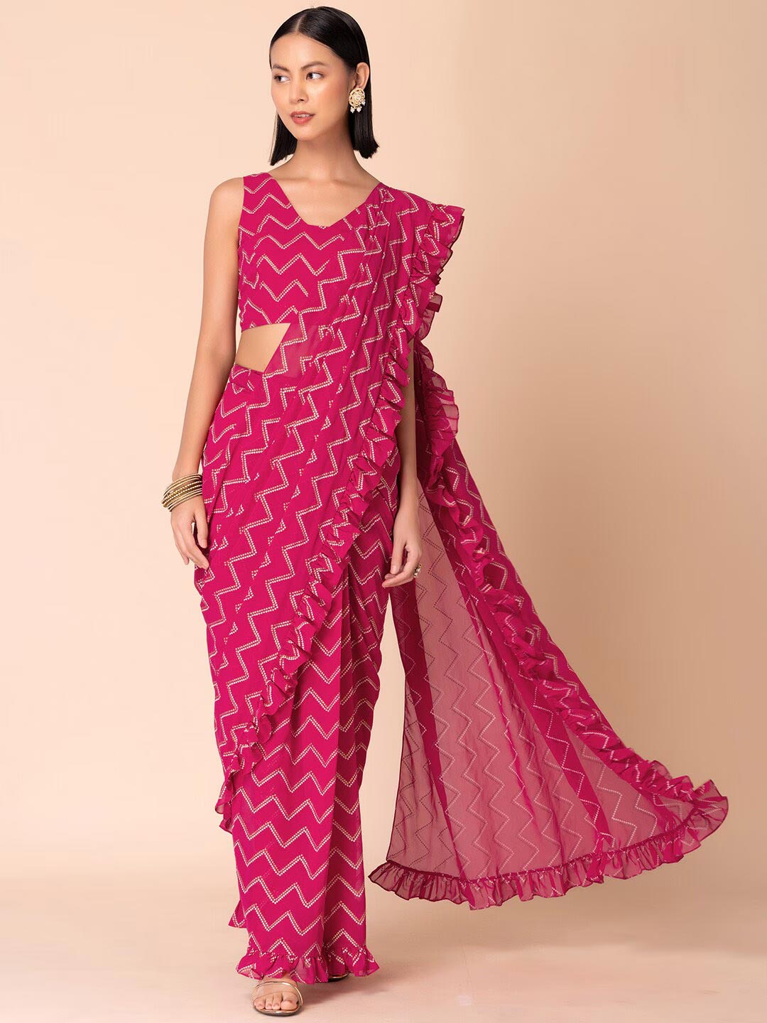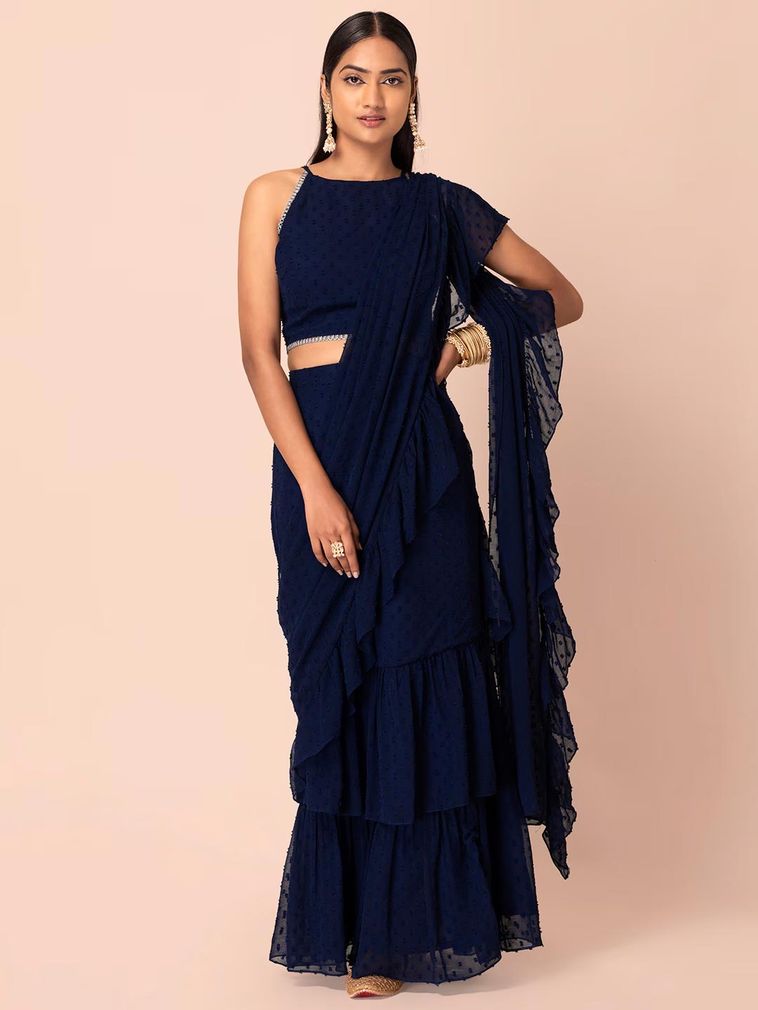 रफल डिजाइन के आउटफिट्स दोबारा से ट्रेंड में आ गए हैं। ऐसे में आप भी इस तरह की रेडी टू वियर साड़ी को स्टाइल कर सकती हैं। यह साड़ी पार्टी या घर में होने वाले फंक्शन में अच्छी लगती हैं। साड़ी ज्यादा हैवी भी नहीं होती है इसलिए आसानी से कैरी की जा सकती हैं। लड़कियां इस तरह के ऑप्शन को ट्राई कर सकती हैं। इससे आपका लुक भी अच्छा लगेगा और आप स्टाइलिश भी नजर आएंगी। यह साड़ी आपको मार्केट में 500 से 1000 रुपये में मिल जाएगी।