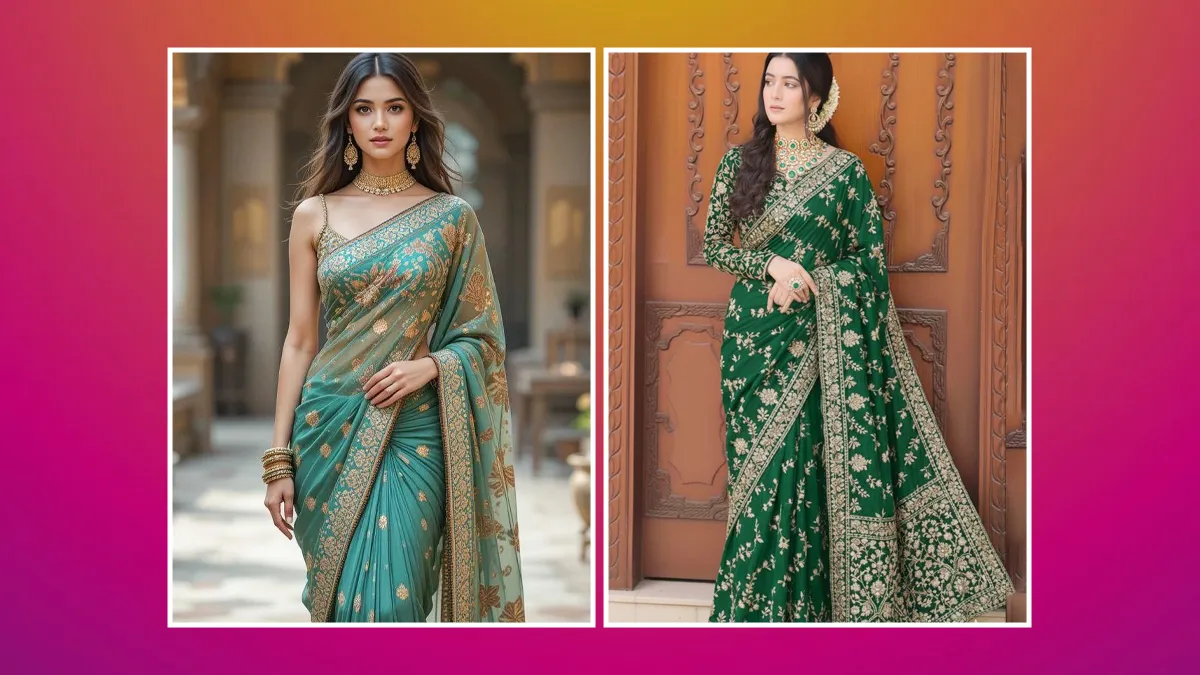 अपने ससुराल में भीड़ से हटकर दिखने के लिए और दुल्हन वाले लुक को खास बनाने के लिए आप बॉटल ग्रीन ऑर्गेंजा फ्लोरल साड़ी डिजाइन को भी ट्राई कर हैं। ऐसी साड़ी ससुराल में पहनने के लिए एक बेस्ट ऑप्शन हो सकती हैं। इसे आप नजदीकी बाजार से खरीद सकती हैं या ऑनलाइन भी आर्डर कर सकती हैं। इसके साथ आप डिजाइनर ब्लाउज बनवाकर अपनी खूबसूरती को दोगुना कर सकती हैं।