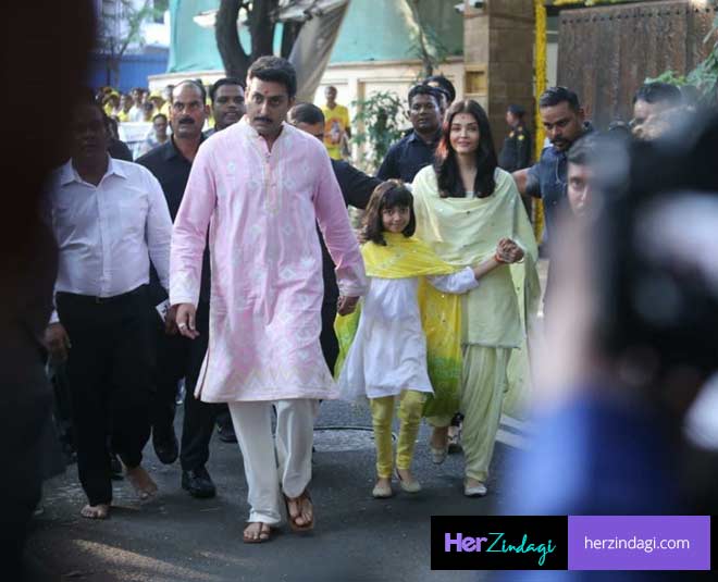 अपने ससुर अमिताभ बच्चन के जन्मदिन पर ऐश्वर्या ने बेटी आराध्या और पति अभिषेक बच्चन के साथ सिद्धी विनायक मंदिर तक पैदल यात्रा कर ससुर के स्वस्थ्य जीवन की कामना की थी। यह तस्वीर उसी समय की है।