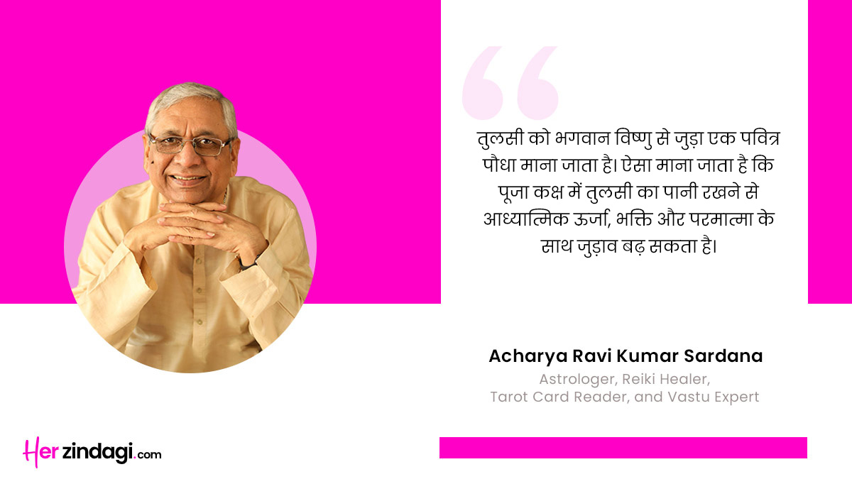 ज्योतिष की मानें तो तुलसी का पानी रखने से घर में सकारात्मक ऊर्जा का वास होता है। तुलसी को विष्णु प्रिय माना जाता है और इसका जल पूजा के स्थान पर रखने से मनोकामनाओं की पूर्ति होने के साथ भगवान विष्णु की कृपा प्राप्त होती है। आइए Acharya Ravi Kumar Sardana, Vastu Expert, Reiki Healer, International Tarot card reader and Astrologer से जानें पूजा के स्थान पर तुलसी का पानी रखने के फायदे क्या हैं।