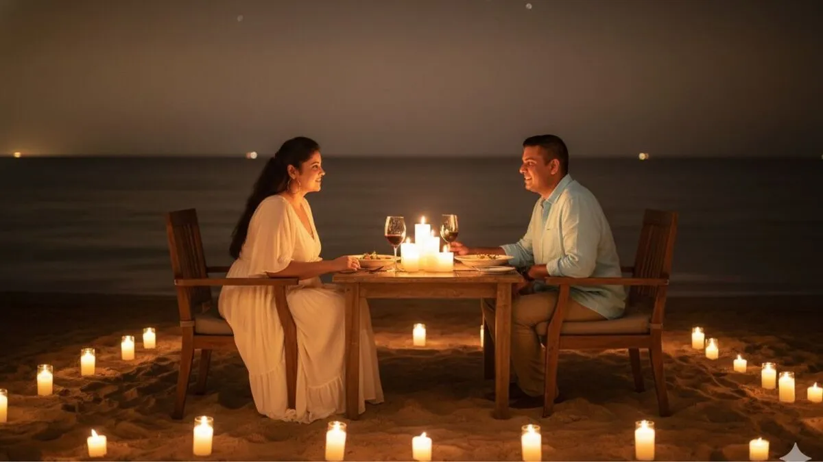 इस दी गई कपल फोटो को रात के समय सिनेमैटिक कैंडल लाइट डिनर सीन में बदल दो। कपल कुर्सी पर बैठे हों, लो लाइट, सॉफ्ट शैडोज, बैकग्राउंड में हल्की फेयरी लाइट्स हों। चेहरा बिल्कुल सेम रहे, कोई बदलाव नहीं, मूवी जैसी फील आए।