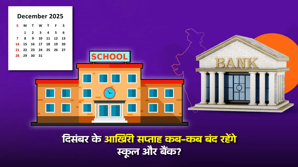Bank & School Holidays December Calender: दिसंबर का महीना खत्म होने के साथ ही साल 2025 भी जाने वाला है। क्रिसमस और न्यू ईयर जैसे बड़े त्योहारों के कारण इस महीने न स्कूल सहित बैंकिंग सेवाएं प्रभावित रहेंगी। खासतौर पर 22 दिसंबर से शुरू होने वाले सप्ताह से ग्राहकों के लिए चुनौतीपूर्ण हो सकता है। अगर आपका कोई जरूरी काम है, तो वह तुरंत करा लें अन्यथा आपको लंबा इंतजार करना पड़ सकता है। ऐसा इसलिए क्योंकि इस दौरान देश के कई हिस्सों में स्कूल और बैंक में लगातार कई दिनों की छुट्टी हो सकती है। आज के इस लेख में हम आपको बताने जा रहे हैं आपके शहर में कितने दिन बैंक बंद रहने वाला है। साथ ही आपके बच्चों का स्कूल में कितने दिन का हॉलीडे है।
