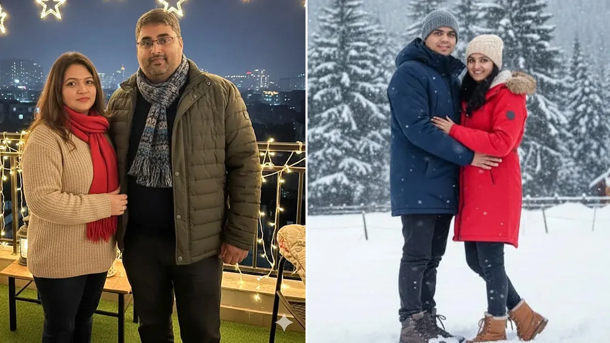 इस फोटो को पहाड़ों में क्रिसमस हॉलिडे वाली फोटो में बदल दो। चेहरों को बिल्कुल भी न बदलना, जैसे हैं वैसे ही रखें। कपड़े बदलकर विंटर कोट, ऊनी टोपी और बूट्स पहना दो। बैकग्राउंड में बर्फ से ढके पहाड़, चीड़ के पेड़, लकड़ी के केबिन हों, क्रिसमस लाइट्स लगी हों और हल्की बर्फबारी हो रही हो। फोटो नैचुरल डे-लाइट में हो, अल्ट्रा-रियलिस्टिक लगे और ट्रैवल फोटोग्राफी जैसा फील आए।