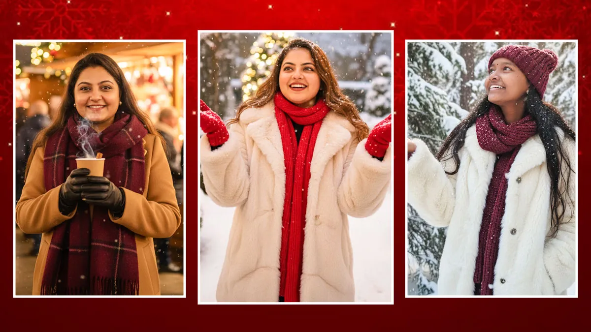 Create a cream coat, red gloves, snowy garden with string lights - playful, bright, vintage holiday feel.