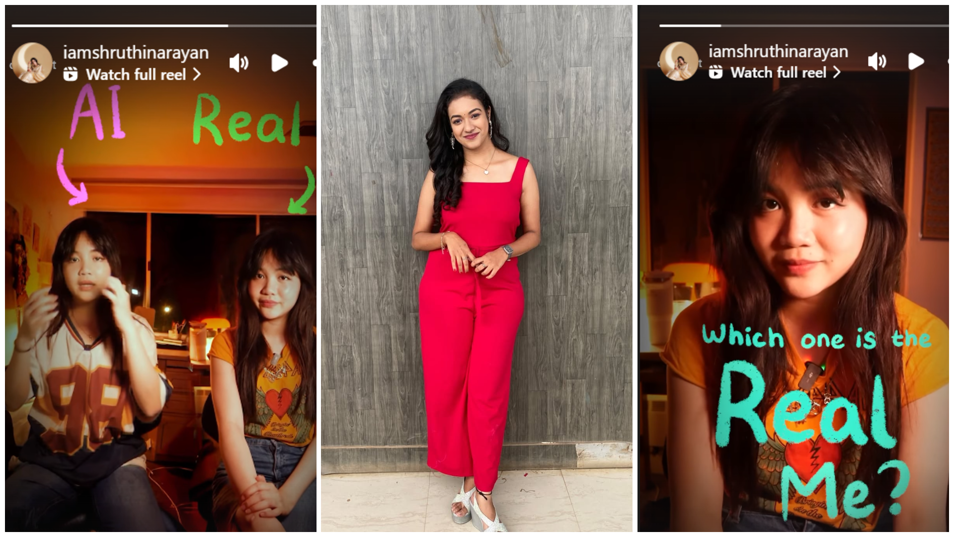 சுருதி நாராயணன் பகிர்ந்துள்ள ரீல்ஸில் ஒரு பெண் செயற்கை நுண்ணறிவு AI தொழில்நுட்பத்தை பயன்படுத்தி தன்னை போலவே ஒரு போலியை உருவாக்கி பேசவும் வைக்கிறார். இதை எப்படி உருவாக்கினேன் என்ற விளக்கத்தையும் கொடுக்கிறார். குறிப்பிட்ட AI தொழில்நுட்பத்தில் முதலில் புகைப்படங்களையும், வீடியோக்களையும் பதிவிடுகிறார். செயற்கை நுண்ணறிவானது அப்பெண்ணின் உடல் அமைப்பையும், அசைவுகளையும் கச்சிதமாக பதிவேற்றம் செய்து கொள்கிறது. அதன் பிறகு தனது பேச்சுகளையும், குரல் வளத்தையும் பதிவிடுகிறார் அப்பெண். மூன்றாவதாக AI உருவாக்கிய பெண் பேசுவதற்கு சில தரவுகளையும் கொடுக்கிறார். இதையடுத்து ஜீன்ஸ் படத்தில் ஐஸ்வர்யா ராய் கண்ணோடு காண்பதெல்லாம் பாடலுக்கு இரட்டை வேடத்தில் ஆடுவது போல் நிஜப் பெண்ணும், AI உருவாக்கிய பெண்ணும் ஒரே வீடியோவில் அருகருகே அமர்ந்து பேசுகின்றனர். இந்த வீடியோவை போலவே தனது புகைப்படங்களை பயன்படுத்தி ஆபாச வீடியோ உருவாக்கப்பட்டு இருப்பதாக சிறகடிக்க ஆசை நடிகை சுருதி நாராயணன் குறிப்பிடுகிறார்.