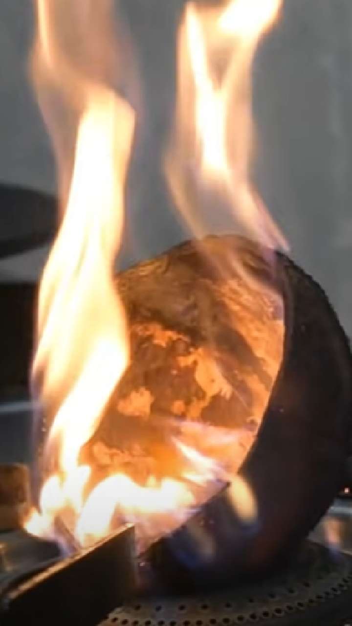 தேங்காய் சிரட்டையில் உள்ள நார்களை சுத்தம் செய்து சிரட்டையை நெருப்பில் வைத்து கருப்பாகும் வரை வாட்டவும்.