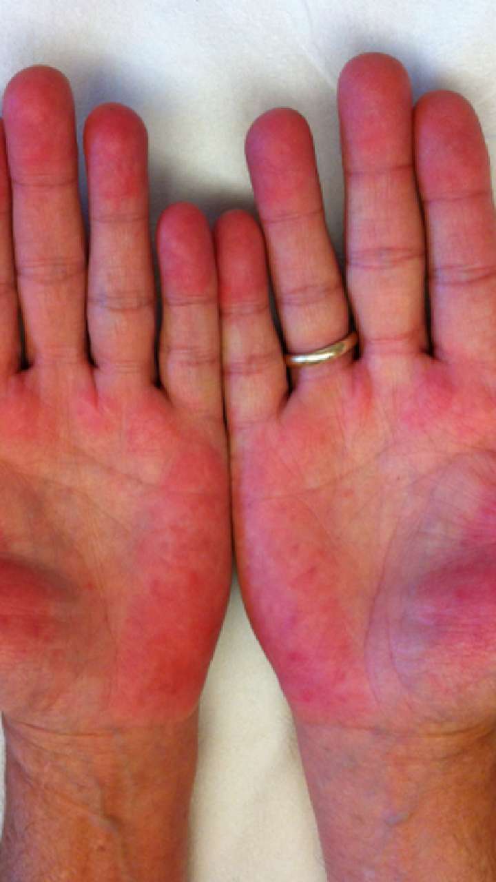 பால்மர் எரித்மா என்பது கொழுப்பு உள்ளங்கைகள் மற்றும் விரல் நுனிகள் சிவப்பு நிறத்தில் மாறுதல். கொழுப்பு கல்லிரல் நோயால் ஈஸ்ட்ரோஜன் அளவுகள் மற்றும் இரத்த ஓட்டத்தில் மாற்றங்கள் ஏற்படுவதால் உள்ளங்கைகள் சிவக்கும்.