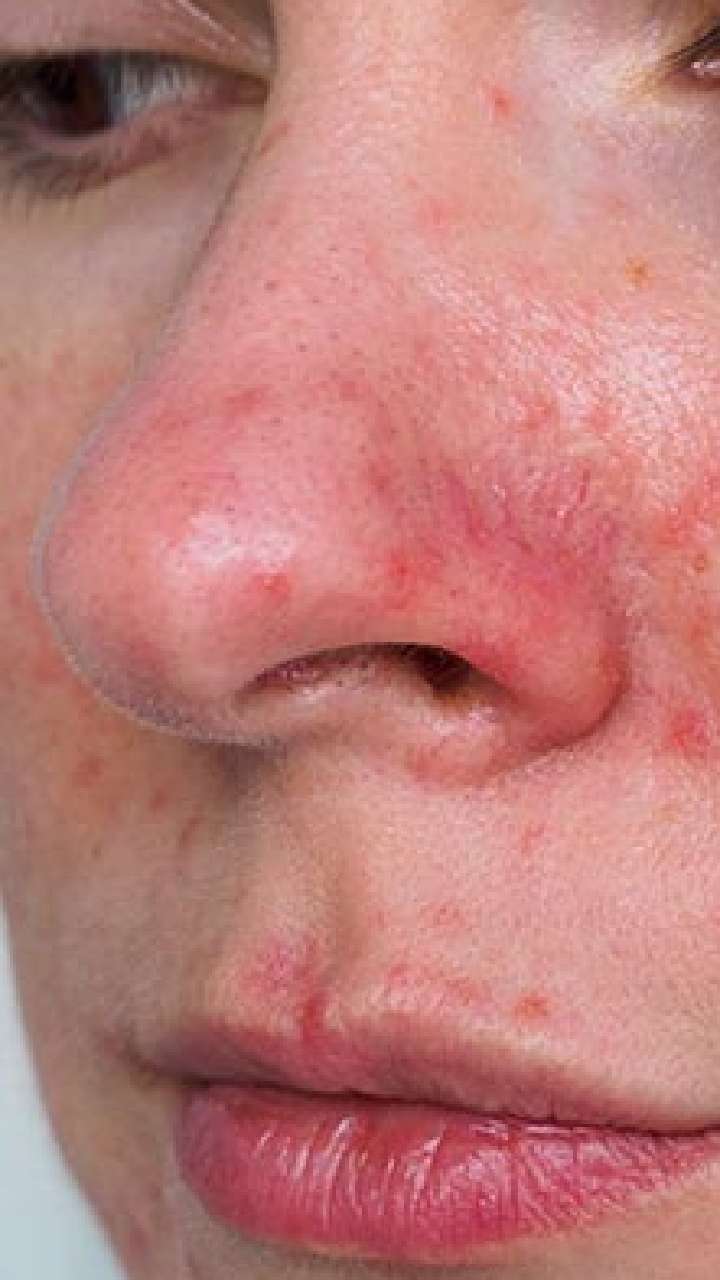 ரோசாசியா என்பது கொழுப்பு கல்லீரல் நோயால் ஏற்படும் நாள்பட்ட தோல் அலர்ஜி. இது முக்கியமாக மூக்கு மற்றும் கன்னங்களை சிவந்து போக செய்யும்.