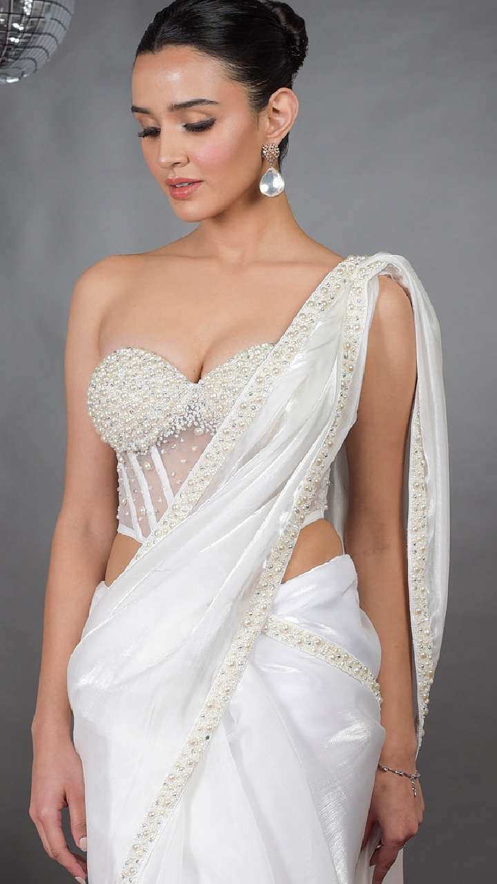 Embrace timeless contemporary elegance with the pearl-embellished bralette blouse. This blouse is perfect to ooze oomph at a cocktail party.