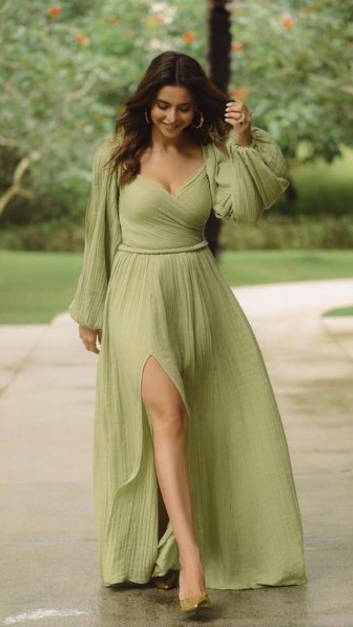 Sharif looked pretty in a sage-green dress with slit balloon sleeves from the brand Chic Le Frique. The outfit featured braided rope detailing on the waist, a statement neckline and a thigh-high slit.