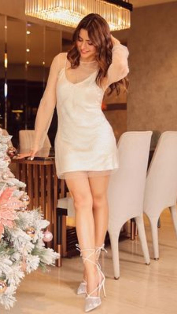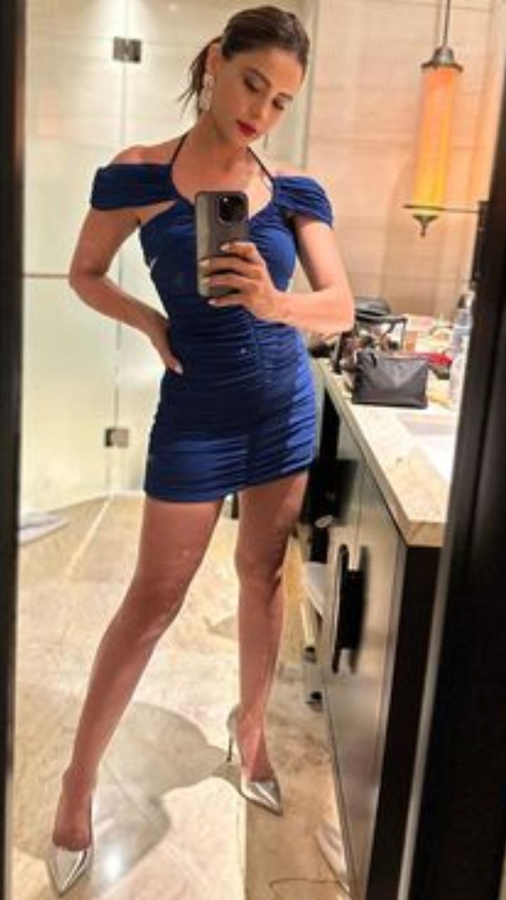 Sharif flaunted her curves in a teal-blue dress with a sweetheart neckline and mesh sleeves. She elevated the look with a statement choker and shimmery makeup.