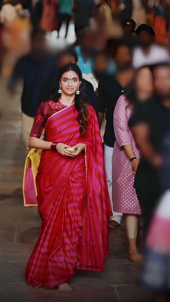 Keerthy suresh styled her classic and vibrant stripe-patterned drape with a boat-neck, floral-printed blouse.
