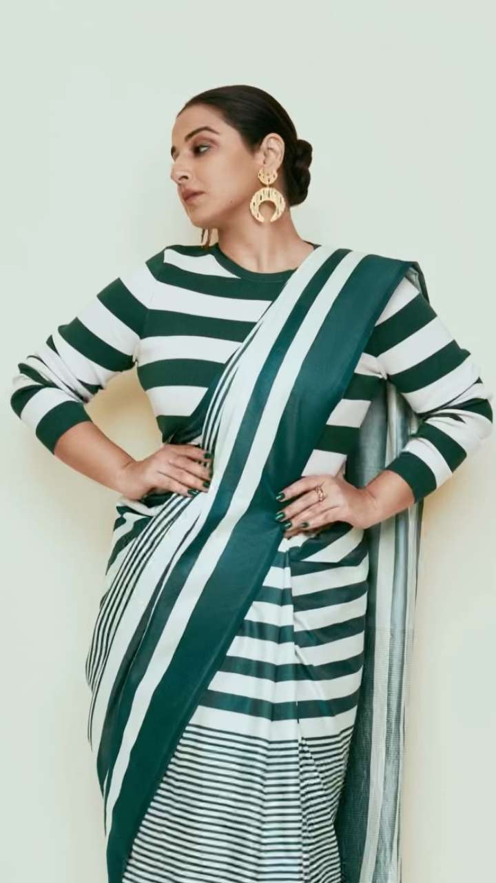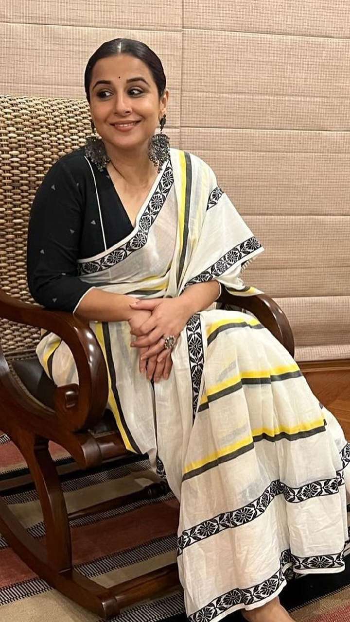 Vidya Balan striked a power pose in a beige and black, strip-printed tussar silk saree, which is apt to slay at the office.