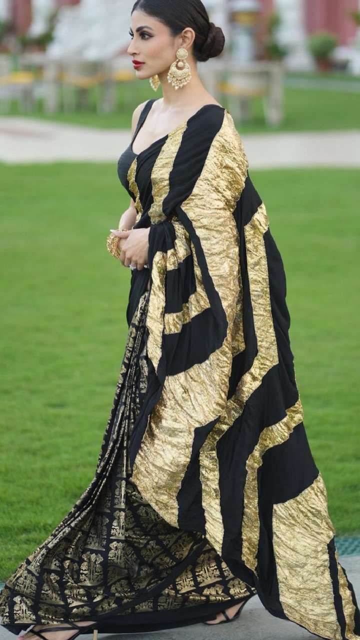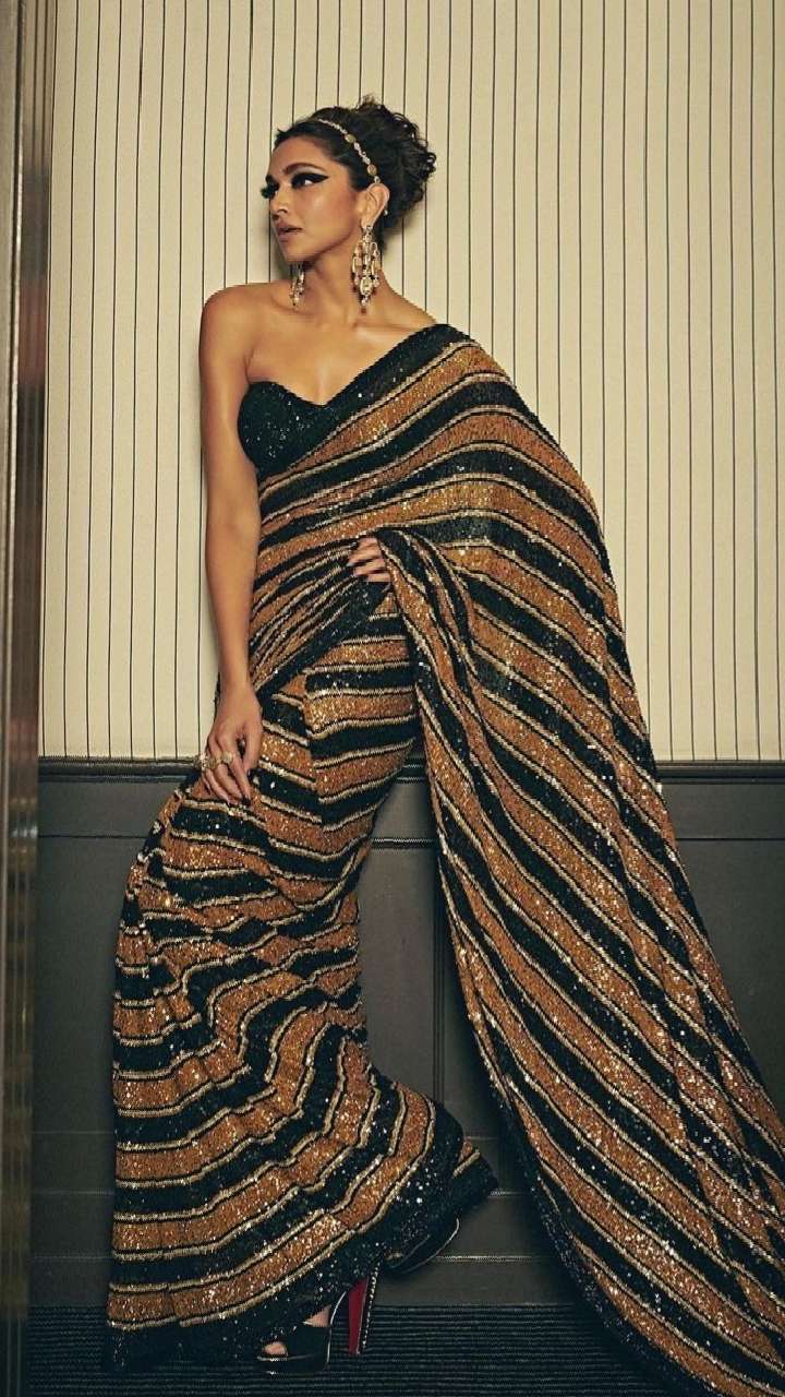Deepika Padukone oozed oomph in a golden and black combination strip saree with sequin embroidery.