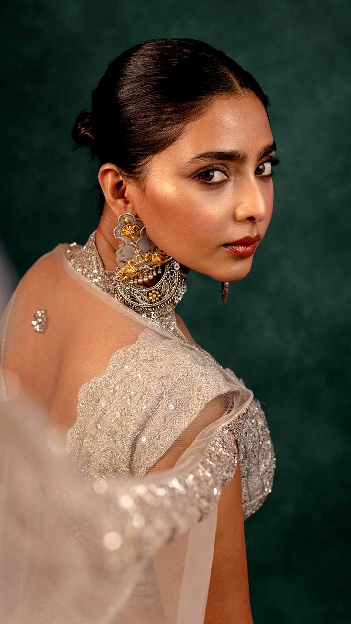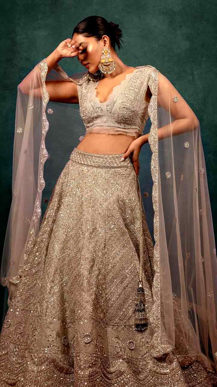 Aishwarya Lekshmi looks bridesmaid ready in this selver embellished shimmery lehenga set.