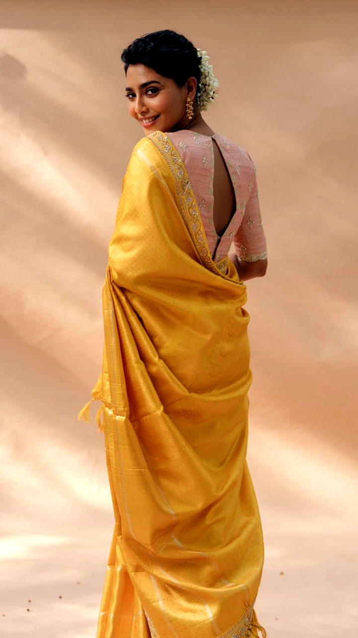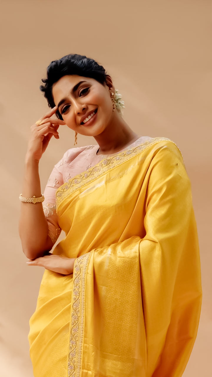 Aishwarya Lekshmi looks elegant in this mustard yellow silk saree paired with a peach blouse.