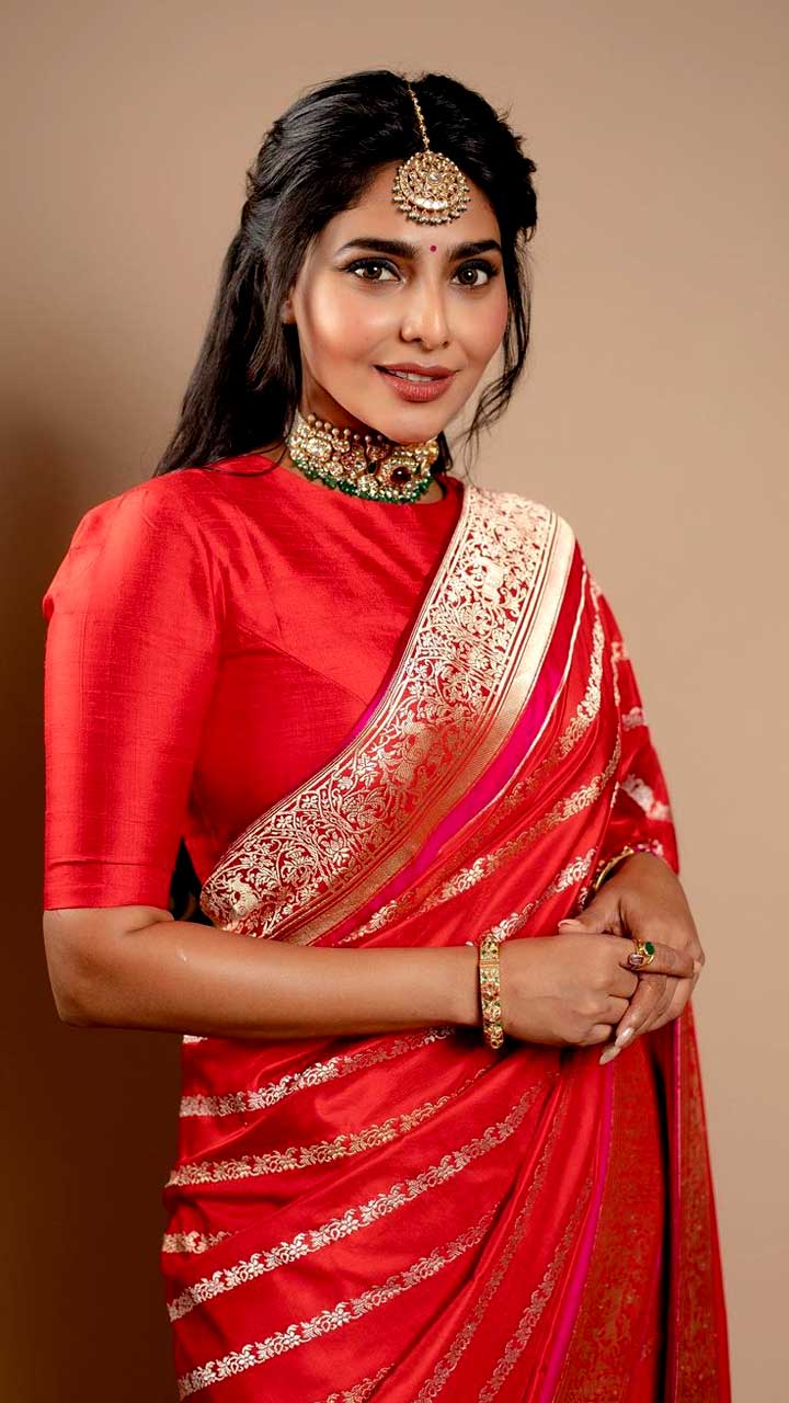 Aishwarya Lekshmi looks gorgeous in this red benarasi saree.