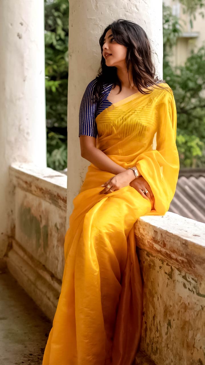 Aishwarya Lekshmi looks graceful int his sunflower yellow organza silk saree paired with navy blue blouse.