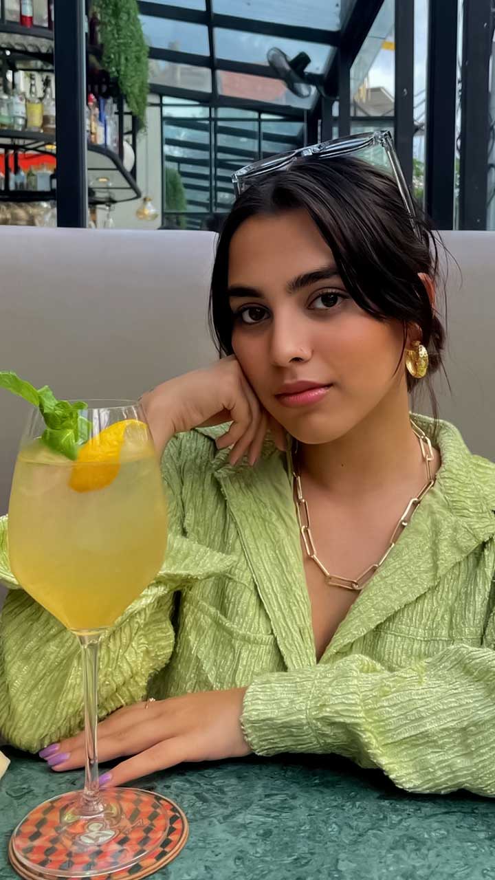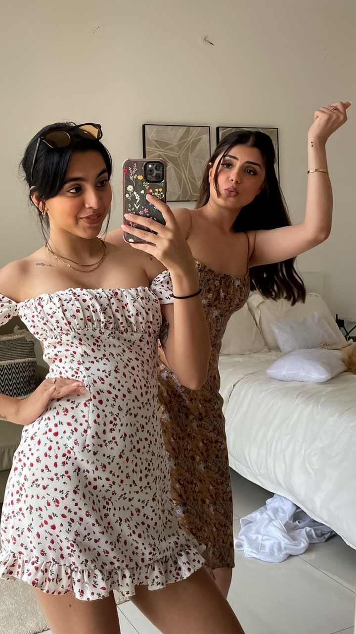 She snapped a mirror selfie with her bestie Muskan Chanana in a cherry-printed white peasant dress. She accessorised the outfit with minimal jewellery and sunglasses.