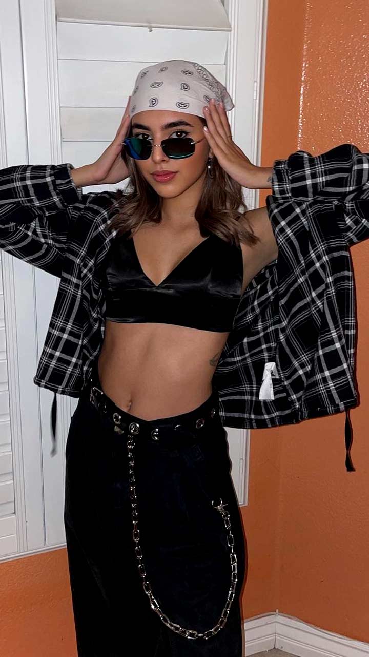 The diva wore a black bralette with a plaid shirt and loose cargo pants with chunky belt detailing to imitate the American popstar Aliyah in a 90's party. She paired the look with a printed bandana and sunglasses.