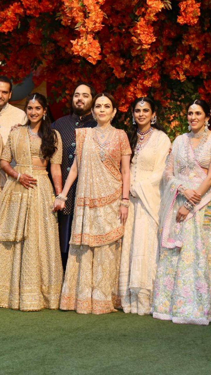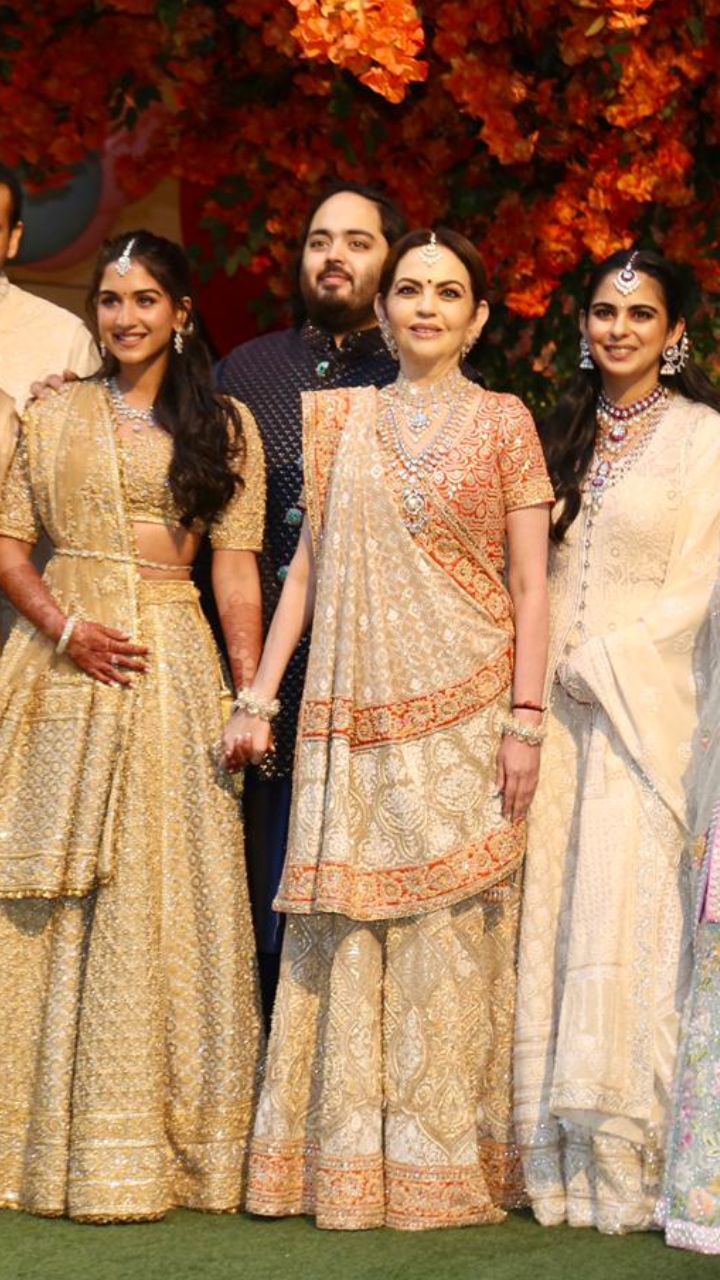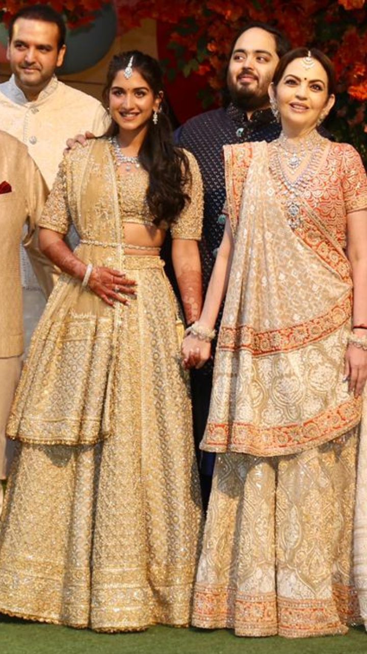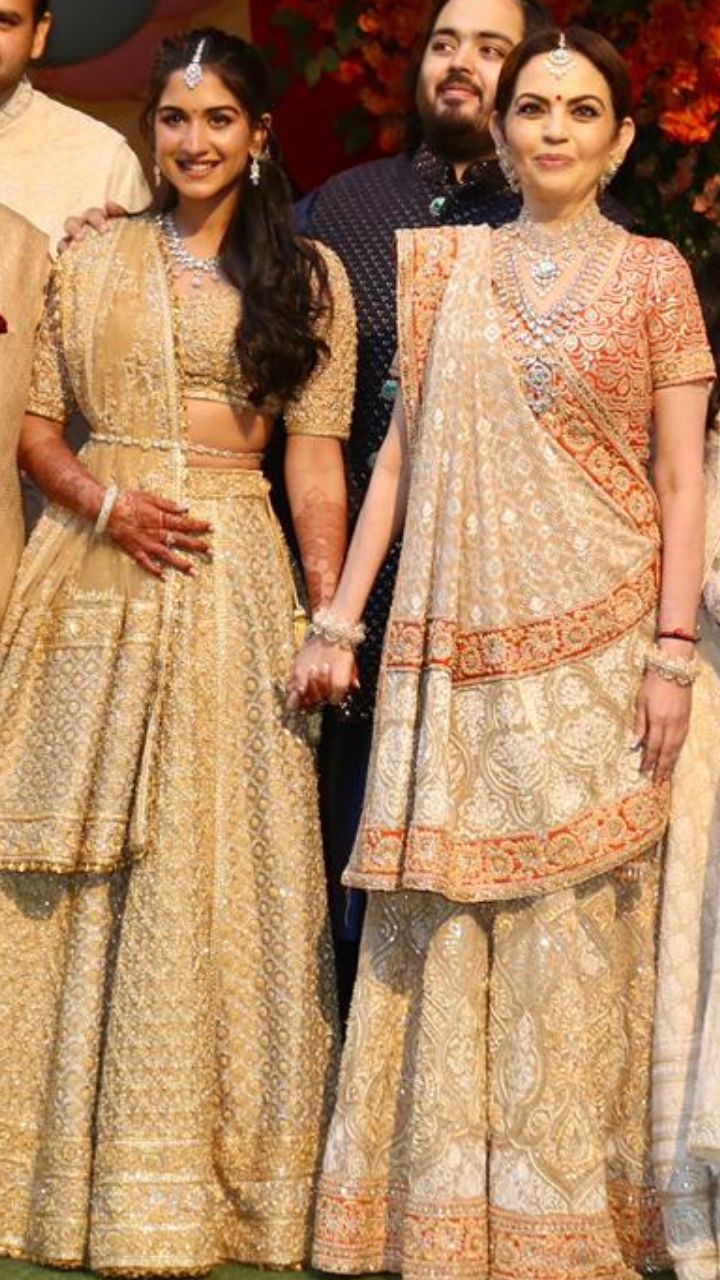 Nita Ambani seems to be twinning with the new bride-to-be Radhika Merchant in embellished lehengas with golden hues. She wore heavy traditional jewellery featuring a studded layered necklace.