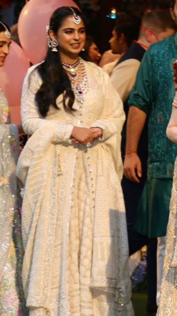 It looks like the daughter and the first daughter-in-law were twinning in ivory outfits. Isha wore an embroidered ivory sharara set comprising a long kurta with a deep slit, sharara and a dupatta.